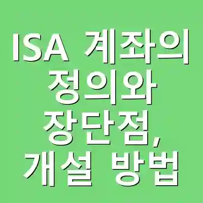 ISA 계좌는 개인종합자산관리계좌(Individual Savings Account)의 약자로, 다양한 투자 상품을 하나의 계좌에서 통합 관리할 수 있는 절세 계좌입니다. 이 계좌는 세금 부담을 줄이면서도 보다 높은 수익률을 추구할 수 있는 장점이 있습니다. 최근에는 비대면으로 손쉽게 개설할 수 있어 많은 투자자들이 관심을 가지고 있습니다. 이 글에서는 ISA 계좌의 장단점, 개설 방법 및 효율적인 활용법을 상세히 설명드리겠습니다.